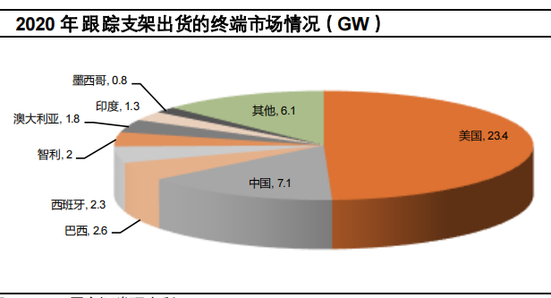 近年,隨著光伏需求的增長以及跟蹤支架性價比的提升,全球跟蹤支架出貨量呈現快速增長。據統計,2020年度全球跟蹤支架出貨 47.5GW,其中美國市場需求23.4GW,占比約50%。此外,拉丁美洲、西班牙、澳大利亞、印度、中東等光照條件比較好的地區的跟蹤支架需求也很可觀。