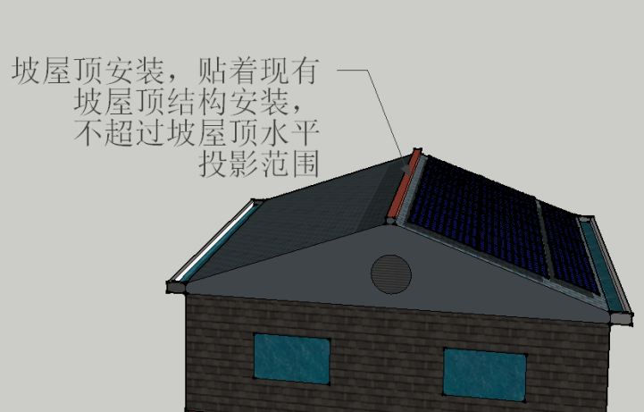 坡屋頂部分加裝太陽能光伏系統(tǒng),原則上貼現(xiàn)有坡屋頂結(jié)構(gòu)架設(shè)且不得超出屋頂范圍。平屋面加裝太陽能光伏系統(tǒng),直接架設(shè)在平屋頂上,且低端距屋面高度小于1.0米、高端距屋面高度小于1.8米、與平屋頂邊緣(女兒墻)距離大于0.5米。